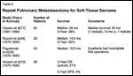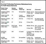 A prospective database from Memorial Sloan-Kettering Cancer Center[9] outlined disease patterns in patients with soft-tissue sarcomas and pulmonary metastases. The median overall follow-up was only 9.7 months, and most patients received optimal multimodality therapy. Important data on tumor location and histology were provided.