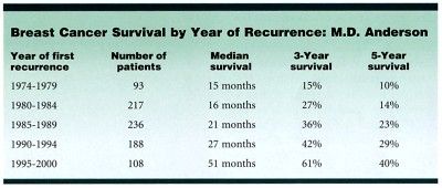 The investigators believe that the differences in survival after a first recurrence among the groups reflect a combination of factors: the development of new chemotherapy agents and regimens and new hormonal therapies, the use of bisphosphonates, and improvements in supportive care.