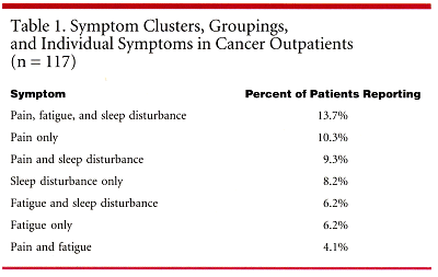 SAN FRANCISCO-More than one-third of cancer outpatients report two or more symptoms such as pain, fatigue, nausea, depression, and sleep disturbances. Because severity of individual symptoms and risk of clinical depression both worsen as the number of symptoms increases, these symptom clusters or groupings have important clinical implications, according to Marylin J. Dodd, RN, PhD, professor of nursing at the University of California at San Francisco.