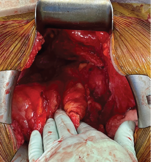 After a multidisciplinary tumor board discussion, a decision was made for surgical reexploration and staging/debulking, as warranted by intraoperative findings. Approximately 3 months after the initial surgery, the patient underwent staging/debulking including trachelectomy, bilateral ureterolysis, bilateral pelvic lymph node dissection, bilateral para-aortic lymph node sampling, partial right colectomy, and omentectomy. No gross residual disease was identified (Figure 5). All pathological specimens were negative for residual malignancy. The final stage was IIIC, grade 1 endometrioid carcinoma, best defined as primary peritoneal carcinoma, given that it arose from peritoneal endometriosis with a lack of a primary organ of origin. After surgical recovery, the patient initiated adjuvant systemic chemotherapy including carboplatin and paclitaxel as per standard guidelines for metastatic ovarian and endometrial endometrioid carcinomas.7 Due to estrogen receptor–positive histology arising from hormonally responsive endometriosis, endocrine maintenance therapy with an aromatase inhibitor is planned upon completion of chemotherapy.