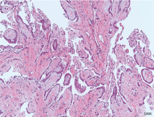 FIGURE 4: Papillary mesothelial proliferation. Papillary fronds lined by bland cuboidal mesothelial cells consistent with well-differentiated papillary mesothelioma. This is considered a tumor of uncertain malignant potential (×100 magnification)