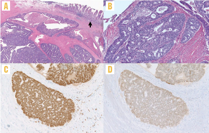 (Figure 2A). The mass consisted of neoplastic glandular proliferation with areas of squamoid differentiation (Figure 2B). There was no intrinsic mucosal abnormality in the ileum, appendix, or colon. Margins were free of tumor and 15 lymph nodes were negative for metastasis. The tumor stained positive for estrogen receptor and PAX8, with equivocal staining for GATA3, CK7, and CDX2 (Figures 2C and 2D).