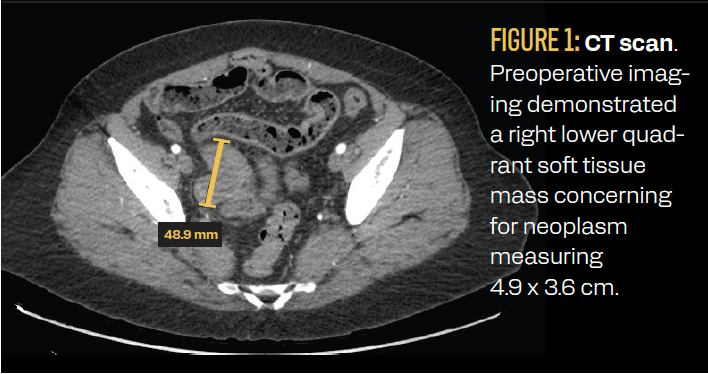 FIGURE 1: CT scan. Preoperative imaging demonstrated a right lower quadrant soft tissue mass concerning for neoplasm measuring 4.9 x 3.6 cm.