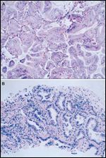 Mucinous BAC occurs in anywhere from 25% to 50% of patients.[11,13] In contrast to nonmucinous tumors, mucinous BAC more commonly presents with extensive disease, manifested as multiple nodules or diffuse consolidation (pneumonic pattern). Because of the more advanced stage at diagnosis, overall prognosis is poorer. Histologically, cells are tall and columnar with basal nuclei and abundant mucin.[12,13] The tumor is thought to arise from metaplastic goblet cells. In mucinous BAC, immunohistochemistry (IHC) results tend to be more variable: CK7 is usually positive, as in nonmucinous BAC; however, CK20 is positive, and TTF1 is usually negative-or weak and patchy if positive. K-ras mutations are more commonly detected in mucinous BAC, likely accounting for the relative insensitivity of this subclass to EGFR-based treatments.[14]