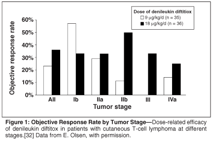 The initial proof-of-concept study of denileukin diftitox in patients with CTCL reported complete responses in 14% and partial responses in 20%, giving a 34% overall response rate.[31] In the subsequent pivotal trial of patients who had failed more than three therapies, the difference in the rates of best response for the two dose groups (9 and 18 µg/kg/d) was not significant. There was, however, a trend suggesting a dose effect in patients with more advanced disease; there was a 38% response rate with 18 µg/kg/day vs a 10% response rate for the lower dose (Figure 1).[32] The reason for this difference may relate to the greater tumor burden in patients with tumors and nodal disease. In the pivotal trial, the overall response was 30%, including 10% complete responses. The median duration of response in the pivotal study was 6.9 months; however, some durable long-term responses were also seen. Thus, patients may experience complete responses with denileukin diftitox, and even partial responses are associated with improved quality of life.[33] This drug may be superior to chemotherapy in debulking tumor disease in MF[34] and other forms of peripheral lymphoma.[35] Denileukin diftitox is safer than chemotherapy because there is no neutropenia and the rate of infection is lower.