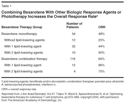 Combining bexarotene with other biologic response agents or with phototherapy has been shown to increase its efficacy. Thus, in a study of bexarotene in 70 patients with CTCL at our center, 54 received bexarotene monotherapy and showed a response rate of 48%. Tightly controlling hyperlipidemia by adding the lipid-lowering agents fenofibrate and atorvastatin (Lipitor) to the treatment regimen was shown to increase the response rate to 70%, and four patients experienced complete responses lasting longer than 4 years. A total of 16 patients received combination therapy of bexarotene with photopheresis, IFNα, or PUVA, producing an overall response rate of 69% (Table 1).[23]