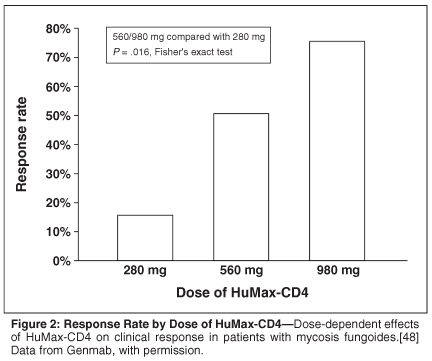 HuMax-CD4 is a monoclonal antibody to CD4. It inhibits signal transduction, cytokine production, and surface-marker expression, and down-modulates CD4 expression. It has been studied in two phase II trials in Europe and the United States that demonstrated dose-dependent responses. Among patients at mixed disease stages of MF, there was a 15% response rate (3/20 patients, with one complete response) at a dose of 280 mg, a 50% response rate (7/14 patients, two complete responses) at 560 mg, and partial response in three of four patients with advanced disease at a dose of 980 mg (Figure 2).[48] A maximal trough serum concentration of HuMax-CD4 > 10 µg/mL was associated with a clinical response. Patients' CD4+ cell counts were reduced, and this reduction was prolonged to at least 24 months in some patients. This, again, was a dose-dependent effect. Further studies to define the optimal dose of this agent are warranted.