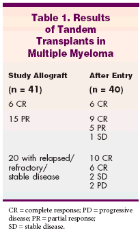 SEATTLE-A two-stage procedurethat combines high-dose chemotherapywith autologous stemcell transplantation (SCT) with animmunosuppressive (but notmyeloablative) allogeneic SCT inmultiple myeloma improves completeresponse rate and decreasestreatment-related mortality.