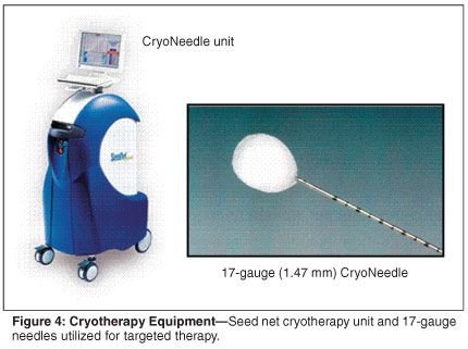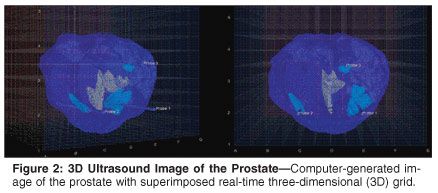 All patients with prostate volume over 50 g (with or without benign prostatic hypertrophy-related symptoms) are offered a 3-month course of a 5-alpha-reductase inhibitor prior to TRUS-MB. We utilize the 5-mm grid biopsy and have developed computer-based 3D software to segment and render a patient-specific 3D ultrasound image of the prostate (Figure 2). We find that the 3D model of the prostate and precise foci identification aids in the treatment protocol (Figure 3). TFT with cryotherapy is then utilized to ablate all foci of cancer using 17-gauge CryoNeedles (Oncura Inc, Figure 4). At an average follow-up of 3 to 6 months, no patient had any major complications. All patients have been discharged postoperatively. It is too early to comment on the results of sexual potency, although an early return appears to be the norm. No patient has reported urinary incontinence after 3 months. Longer follow-up is necessary and will be the subject of a future manuscript.