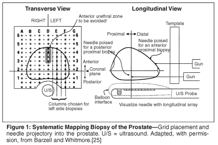 There are two approaches to systematic biopsies-the transrectal and transperineal routes.[23] The most common clinical indication for recommending transperineal saturation biopsy is the finding of multiple negative TRUS biopsies with persistent high-risk parameters, such as rapid PSA doubling times and/or DRE abnormality. Transperineal biopsy aided by a grid has the advantage of uniform sampling of the whole prostate and better sampling of the transitional zone.[24] Moreover, this approach provides the added benefit of mapping the prostate by providing approximate coordinates of prostate cores.