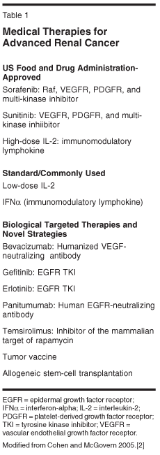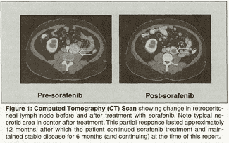 This article presents the case of a 59-year-old male with metastatic renal cell carcinoma (RCC) initially treated with interleukin-2 (IL-2, Aldesleukin, Proleukin) plus pegylated interferon-alfa (PEG IFNα), who then developed disease progression requiring further therapy. Since identification in 1993 of the Von Hippel-Lindau (VHL) gene, which is involved in the majority of genetic alterations in clear cell RCC, several agents targeting key molecular pathways active in RCC tumorigenesis (eg, vascular endothelial growth factor receptor [VEGF], epidermal growth factor receptor [EGFR], platelet-derived growth factor B [PDGF-B] receptor, and others) have been developed and are being evaluated in clinical trials, including the recently approved targeted agent sorafenib (Nexavar; formerly known as BAY 43-9006) (Table 1).[1,2]