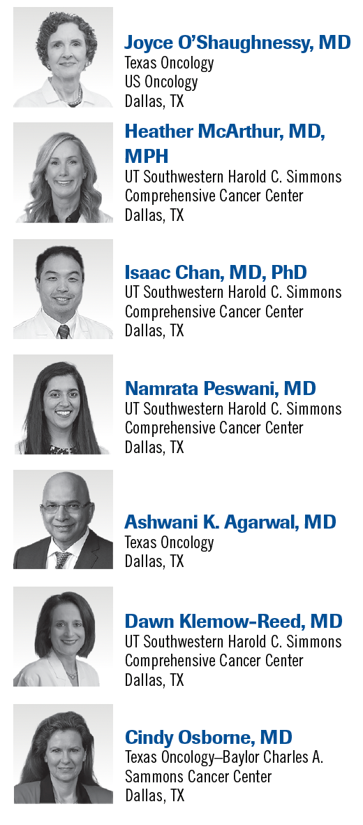 The panel was led by Joyce O’Shaughnessy, MD, the Celebrating Women Chair in Breast Cancer Research at Baylor University Medical Center and director of the Breast Cancer Research Program at Texas Oncology, US Oncology, in Dallas, Texas. Panel members included Heather McArthur, MD, MPH, Komen Distinguished Chair in Clinical Breast Cancer Research and associate professor of medicine in the Department of Internal Medicine at UT Southwestern Medical Center in Dallas; Isaac Chan, MD, PhD, assistant professor of medicine in the Department of Internal Medicine at UT Southwestern; Namrata Peswani, MD, assistant professor of medicine in the Department of Internal Medicine at UT Southwestern; Ashwani K. Agarwal, MD, hematology/oncology clinician at Texas Oncology; Dawn Klemow-Reed, MD, medical oncologist at UT Southwestern; and Cindy Osborne, MD, a breast medical oncologist at Texas Oncology.