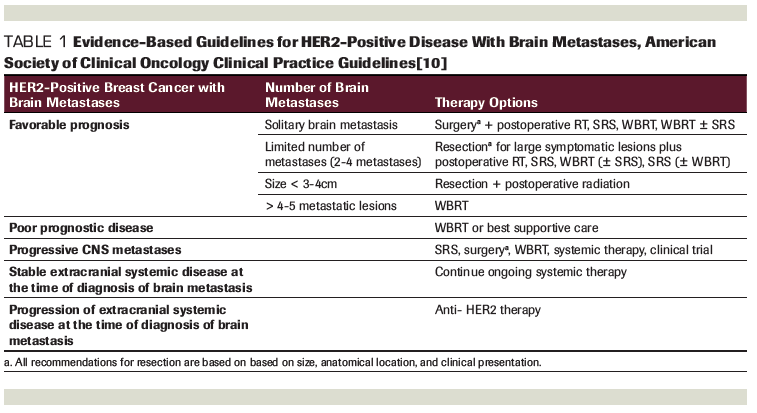 TABLE 1: Evidence-Based Guidelines for HER2-Positive Disease With Brain Metastases, American Society of Clinical Oncology Clinical Practice Guidelines[10]