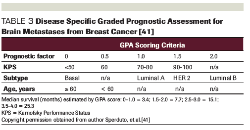 There are validated prognostic scoring systems for these patients. The most helpful and specific prognostication tool for breast cancer brain metastases is the diagnosis-specific graded prognostic assessment (GPA), which includes age, performance status, and breast cancer subtype. Median survival varies with GPA score, with a score of 0 to 1 predicting a survival of 3.4 months to a score of 3.5 to 4 predicting a median survival of as high as 25.3 months (Table 3).[41]