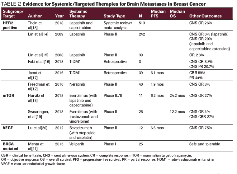 TABLE 2: Evidence for Systemic/Targeted Therapies for Brain Metastases in Breast Cancer