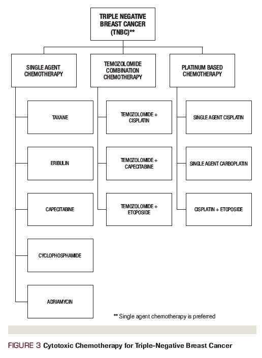 The backbone of therapy in this subset of triple-negative breast cancer (TNBC) is cytotoxic chemotherapy, as there are no targetable receptors. There is some evidence of CNS response with chemotherapy. Agents demonstrating efficacy include cisplatin-based regimens and single-agent capecitabine.[25,26] Rosner et al in 1986 described various regimens combining cyclophosphamide, methotrexate, anthracyclines, and fluorouracil for objective responses up to 50%.[27] Temozolomide, an oral alkylating agent, has shown activity in brain metastases arising from breast cancer in combination with other chemotherapy such as cisplatin, capecitabine, or etoposide.[25,28]