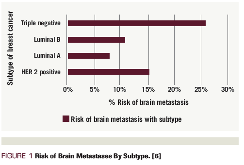 The risk of developing brain metastases arising from breast cancer varies by subtype as a result of the natural history of each. Basal tumors (estrogen receptor [ER]/progesterone receptor [PR]-/anti-human epidermal growth factor receptor 2 [HER2]-) and HER2-positive tumors (ER/PR-/HER2+) have an increased risk of developing brain metastases ranging from 25% to 27% and 11% to 20%, respectively. Luminal tumors are least likely to metastasize to the brain, with luminal A (ER/PR+/HER2-) at lowest risk of 0.7%, while luminal B (ER/PR+/HER2+ or ER/PR+ or -/HER2-) is slightly higher at 12%, due to the HER2 positivity.[4–6] Figure 1 demonstrates the risk of developing brain metastasis in accordance with the subtype of breast cancer.[6] The recognition of molecular subtypes has improved the understanding of the genomic landscape and heterogeneity of the disease, which has been and continues to be one of the important obstacles to advancements in the prognosis and treatment of the disease.