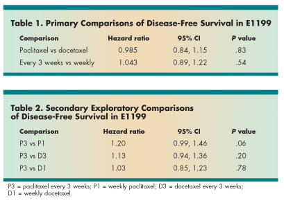 In an unplanned analysis of relapse, he said, "There were about 15% fewer relapses in the P1 and D3 arms, compared with the P3 arm." In secondary exploratory analyses comparing the standard P3 arm vs the other arms, there was a trend favoring the weekly paclitaxel arm vs the every-3-week arm (hazard ratio 1.20; P = .06). The other comparisons demonstrated no differences for the D1 arms (see Table 2).
