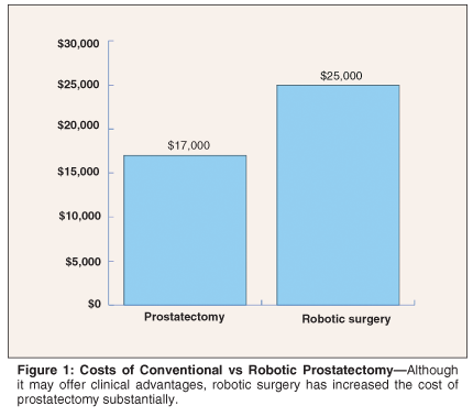 Although it may offer some clinical advantages, robotic surgery has increased the cost of prostatectomy substantially. Based on Medicare reimbursement for the year 2007, the total allowable reimbursement for a radical prostatectomy as an inpatient procedure is approximately $17,000.[3,4] In contrast, the robot has a $1 million purchase cost, a $100,000 to $200,000 annual maintenance fee, and approximately $2,000 to $3,000 in disposables per case.[1,8] The costs for the robot increase the cost of prostatectomy from approximately $17,000 to $25,000/patient (Figure 1).
