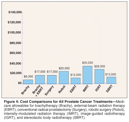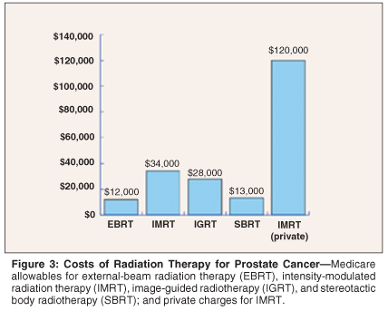In contrast to robotic surgery, better-quality radiation therapy has clearly increased cure rates for patients with prostate cancer. However, IMRT comes at a substantial cost premium due to the increasingly sophisticated hardware and technical skill required for daily therapy delivery. The Medicare allowables for conventional EBRT for prostate cancer total approximately $12,000.[1] In contrast, Medicare allowables for IMRT, IGRT (including helical TomoTherapy), and SBRT (including CyberKnife) are $34,000, $28,000, and $13,000, respectively.[3,4] Interestingly, private charges for IMRT may approach $120,000 per patient (Figure 3).[1]