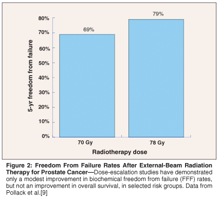 However, dose-escalation studies in randomized, controlled settings have demonstrated only a modest improvement in biochemical freedom from failure (FFF) rates, without an improvement in overall survival, in selected risk groups.[9,10] For instance, Pollack et al showed FFF rates of 69% and 79% at 5 years for the 70-Gy and 72-Gy treatment groups, respectively (Figure 2).[9] Kuban et al showed FFF rates of 53% and 55% at 8 years for patients treated with >= 60 Gy but < 70 Gy vs >= 70 Gy, respectively.[10]