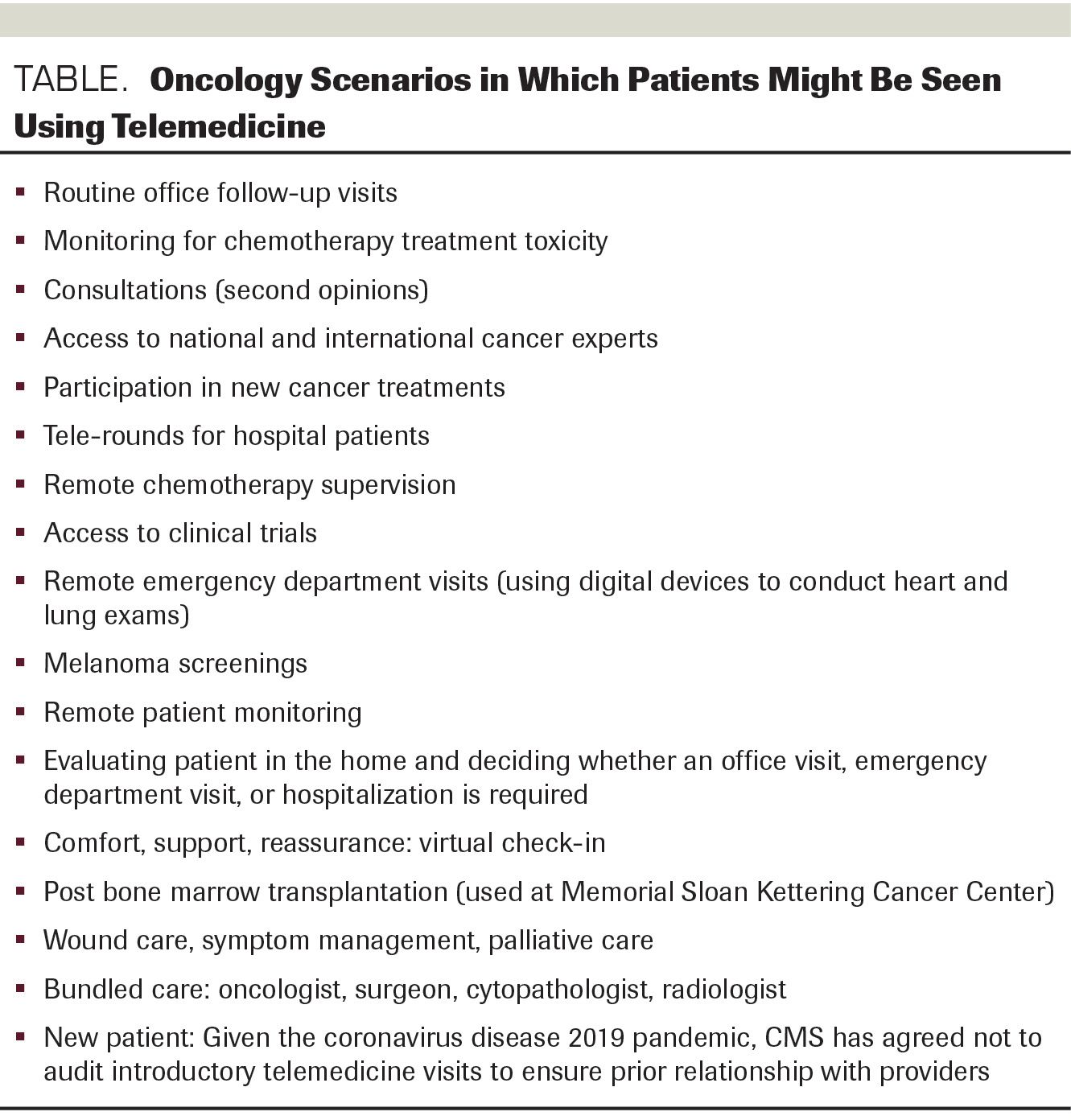 TM was first embraced by primary care physicians, dermatologists, and radiologists, and now specialists—even obstetricians and surgeons—use TM as well.15 Many of the potentially appropriate uses of TM in oncology patients are shown in the Table. Providing care for a new patient is a special case: In the past, caring for a new patient without establishing rapport, face-to-face, was not recommended. However, because of coronavirus 2019 (COVID-19), CMS has relaxed Health Insurance Portability and Accountability Act restrictions and decided that they will not audit practices and/or doctors who use TM to provide initial care.