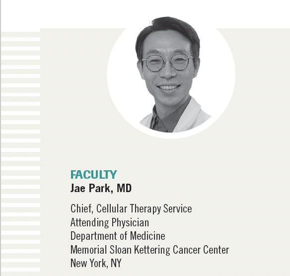 Disclosures (Dr Park): Consultant: Allogene, Amgen, Artiva, Autolus, Be Biopharma, BeiGene, Bright Pharmaceutical, Caribou Biosciences, Galapagos, IN8Bio, Kite, Medpace, Minerva Biotechnologies, Pfizer, Servier, Sobi, Takeda; Stockholder: Curocell.