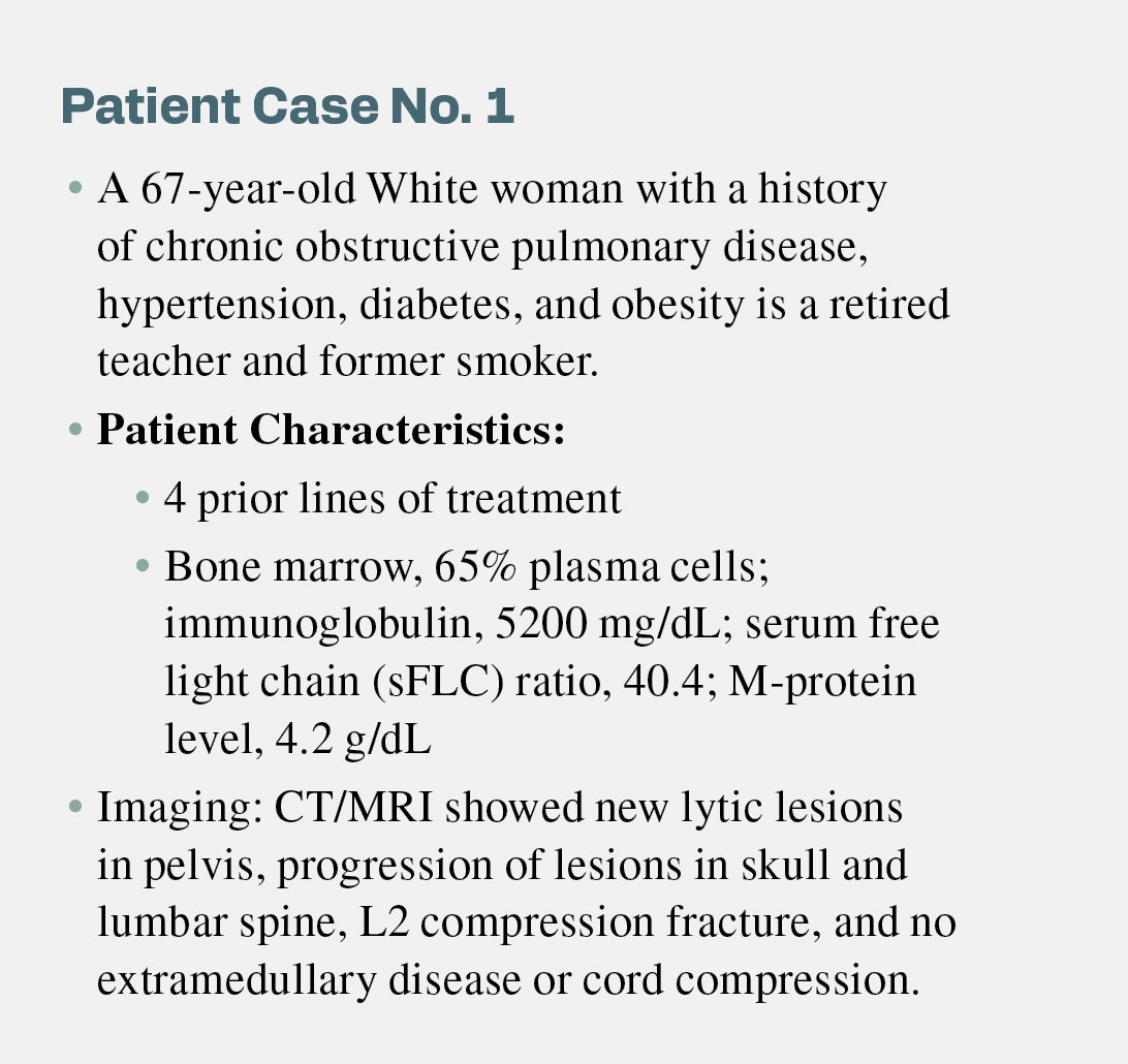 Anderson / She’s had 4 prior lines of therapy, has rapidly progressive disease, and has rapidly declining performance status, with poor [activity of daily living] capacity. An off-the-shelf product that you can give within a week probably makes the most sense, like a bispecific.