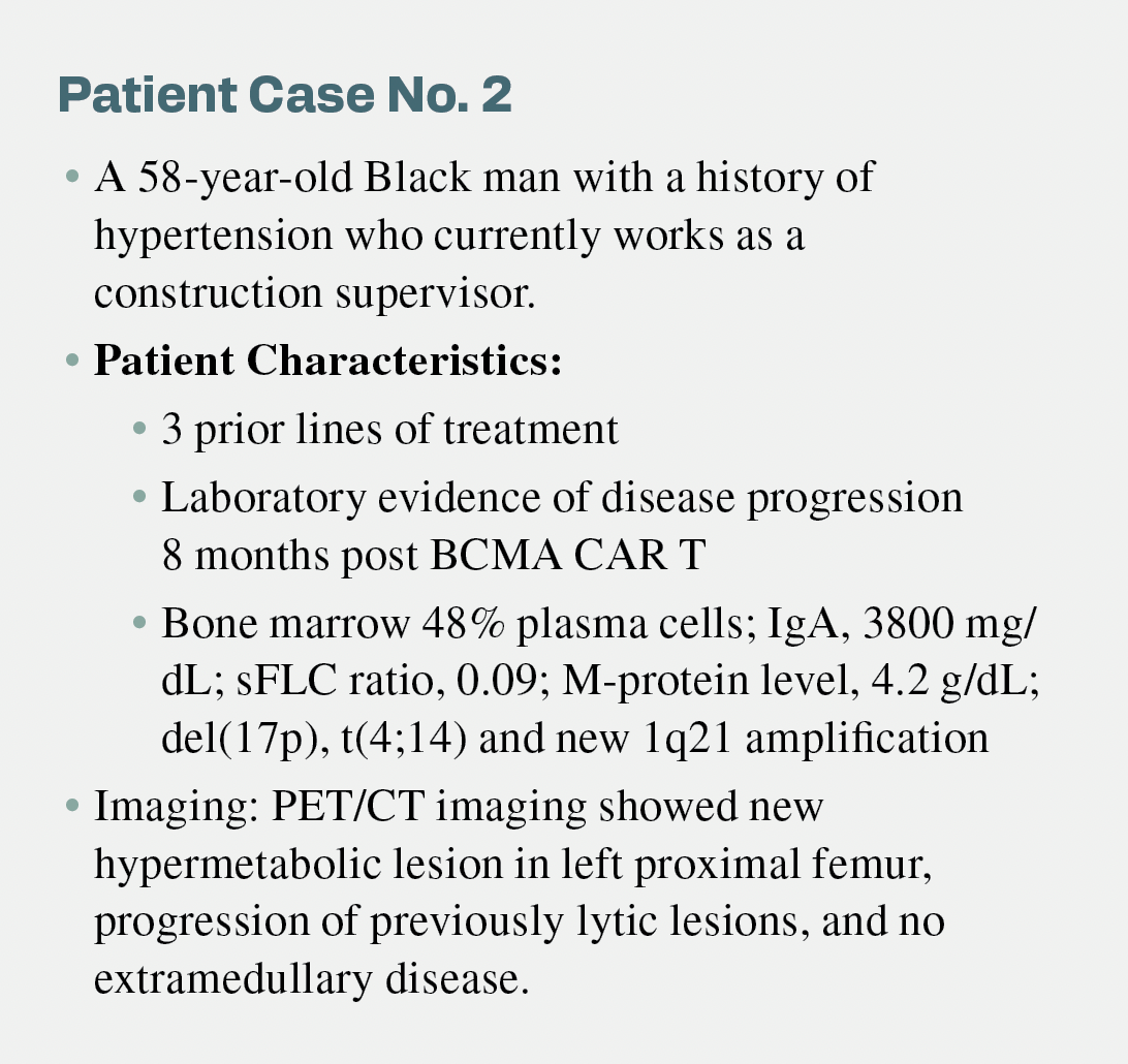 Anderson / In this case, it’s the gray zone [because] it’s at 8 months. There are data [that show] if it’s beyond 6 months, you’re OK with another BCMA—some data show…after 9 months. Since it’s an aggressive relapse and right in that gray zone, the GPRC5D would make the most sense. I would also agree with sending for BCMA mutation testing in case that doesn’t work. Then you have a backup plan to see if the BCMA therapy would work after that.