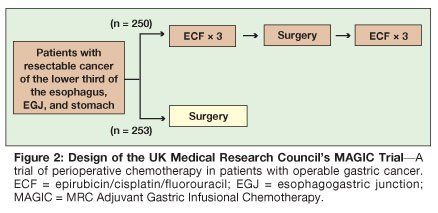 The apparent success of preoperative chemotherapy in esophageal cancer[14] prompted the development of a similar approach in gastric cancer. A neoadjuvant approach could potentially demonstrate in vivo tumor sensitivity, resulting in tumor regression/downstaging and a higher chance of R0 resection, while treating distant micrometastatic disease at an earlier time after the patient's initial diagnosis. The ECF regimen (epirubicin [Ellence] at 50 mg/m2, cisplatin at 60 mg/m2, both given on day 1, and 5-FU at 200 mg/m2/d given continuously throughout a 21-day cycle) showed considerable activity in the phase II setting, and was the most active of regimens tested in the phase III setting, with superior quality-of-life data compared to the available alternatives.[15-17]
