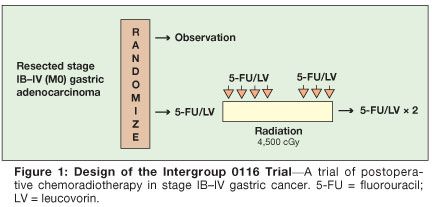 Because of the high rate of locoregional relapse, including recurrences in the gastric bed after potentially curative resection,[12] the addition of radiotherapy to chemotherapy is appealing as a means of affording greater local control. The Southwest Oncology Group and the US Intergroup designed a randomized controlled trial to compare postoperative chemoradiotherapy to observation alone in patients who had undergone potentially curative resection[10].