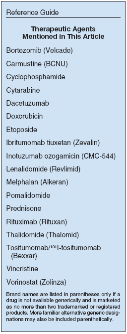 Several earlier clinical trials had evaluated myeloablative doses of 131I-tositumomab followed by ASCS in elderly DLBCL patients, or the incorporation of 90Y-ibritumomab tiuxetan or 131I-tositumomab into various conditioning regimens in the ASCS or allogeneic bone marrow transplant setting-for example, CyVP16 (cyclophosphamide and etoposide) followed by ASCS, or BEAM (carmustine [BCNU], etoposide, cytarabine, melphalan [Alkeran]) followed by ASCS-in patients with DLBCL. The addition of either 90Y-ibritumomab tiuxetan or 131I-tositumomab to currently available conditioning regimens did not result in additional significant toxicity, and the relapse-free and overall survival at 2 or 3 years was 74% and 93% for 90Y-ibritumomab tiuxetan plus CyVP16–treated patients, and 39% and 55% for patients receiving the 131I-tositumomab plus BEAM regimen, respectively.[3,5]