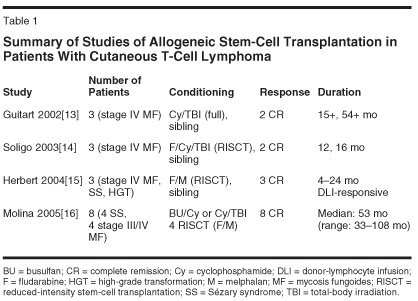 13. Guitart J, Wickless SC, Oyama Y, et al: Long-term remission after allogeneic hematopoietic stem cell transplantation for refractory cutaneous T-cell lymphoma. Arch Dermatol 138:1359-1365, 2002.