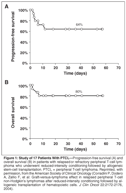 Establishment of a GVL effect is key in RISCT, as this is the prime mediator of long-term disease control. The presence of a GVL effect has been demonstrated to some extent in a study of 17 patients with PTCL.[12] Conditioning was with thiotepa/fludarabine/cyclophosphamide; 16 patients had sibling transplants, 1 an unrelated donor. Over 2 years, 14 of the 16 patients remained alive and 12 were in complete remission. This is extremely good efficacy in a group of patients with refractory/relapsed disease whose chance of being alive at 2 years with conventional treatment is less than 10%. Moreover, of the four patients who relapsed, two responded to donor-lymphocyte infusion. Thus, OS (80%) was greater than PFS (64%), indicating that some patients who relapsed could be rescued by donor-lymphocyte infusion and other modulatory therapies (Figure 1).