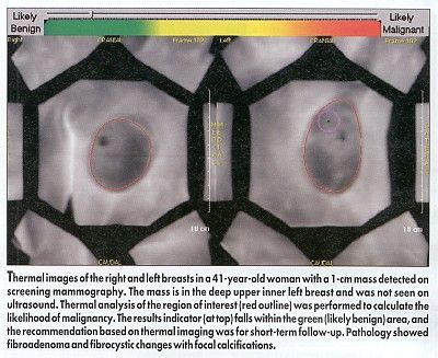 Thermal imaging provides physiologic information about suspicious areas of the breast. The physiologic basis for thermal imaging for cancer detection is the difference in infrared emissions of normal and malignant tissues upon cooling. This difference results, in turn, from differences in angiogenesis, vascular reactivity, the release of vasoactive mediators, and metabolic activity.