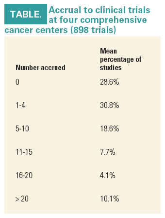 Out of all 898 clinical trials (all phases) conducted at these CCCs, 28.6% had zero accruals (see Table). Studies not sponsored by the CTCG actually were slightly more successful. In those studies, 20.6% accrued zero patients. Five patients or more were accrued to 40.5% of non-CTCG studies and 54.6% of CTCG trials.