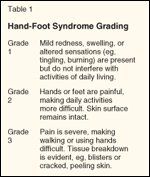 The hand-foot syndrome is associated with a grading system (see Table 1), reflecting the fact that increasing the duration of exposure increases the severity of the syndrome. Grade 1 hand-foot syndrome merely reflects some mild erythema and swelling on the palms with a minor sensation most probably secondary to subepidermal swelling. In the more severe grades of hand-foot syndrome, the palms and soles are affected with blister formation, profound discomfort, and the inability to hold objects or even to walk.