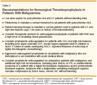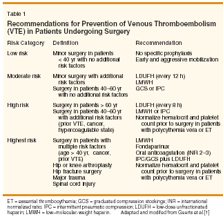 Although VTE prophylaxis is typically continued until hospital discharge, the risk of VTE extends beyond the hospital stay. Extended prophylaxis was investigated in the Enoxacan II Study of 322 patients undergoing surgery for abdominal or pelvic cancer.[6] After initial prophylaxis with enoxaparin, 40 mg daily for 6 to 10 days, patients were randomized to continue placebo or enoxaparin for an additional 3 weeks. Extended prophylaxis was associated with a 60% reduction in the incidence of total VTE at 1 month (4.8% vs 12%; P = .02) and at 3 months (5.5% vs 13.8%; P = .01) without a significant increase in the risk of minor, major, or total bleeding. Thus, once-daily LMWH and threetimes- daily UFH appear to be equally effective in preventing VTE in patients with malignancy undergoing general surgery. Similar findings have been observed in patients undergoing surgery for breast and gynecologic malignancies.[ 7] Despite higher drug acquisition cost, LMWH offers advantages over UFH, including once-daily dosing, which improves patient acceptance and limits nursing time, and a lower incidence of heparin-induced thrombocytopenia. Decision analytic models have estimated that LMWH is cost-effective for prophylaxis in gynecologic oncology surgery.[8] However, similar analyses have not yet compared once-daily LMWH vs threetimes- daily UFH in other settings, nor are there data regarding the cost implications of extended prophylaxis. Well-designed prospective trials are needed to gather this information for optimal, evidence-based practice. Similar aggressive prophylactic anticoagulation strategies are indicated for the perioperative management of patients with hematologic malignancies, including polycythemia vera and essential thrombocythemia. In patients with polycythemia vera, the hematocrit should be normalized before elective surgery (ie, to < 45% in men and < 42% in women) to minimize the risks of thrombosis and bleeding. It is also recommended that the platelet count be normalized preoperatively in polycythemia vera or essential thrombocythemia patients with high-risk features (ie, age > 60 years or prior thromboembolic event). Although lowdose aspirin (ie, 100 mg/d) minimizes the nonsurgical risk of arterial and venous thromboemboli in patients with polycythemia vera,[9] the benefit of aspirin in the perioperative setting is untested and one must weigh the theoretical benefit against the potential risks of bleeding. Primary Prophylaxis in Hospitalized Medically Ill Patients