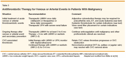 Chronic anticoagulant therapy beyond 3 and 6 months has not been systematically evaluated in patients with malignancy-associated VTE, nor has LMWH been compared to oral anticoagulation for longer than the first 6 months. However, chronic anticoagulation is superior to shorter-term therapy among patients with idiopathic thrombosis, including many who have hypercoagulable conditions that are persistent risk factors for thrombosis.[ 24] Also, the rate of recurrent VTE in patients with malignancy is high despite therapeutic anticoagulation.[31] Thus, malignancy should be considered a persistent strong risk factor for thrombosis, and post-VTE treatment should continue for as long as the neoplastic disorder and/or the interventionrelated prothrombotic risks are present. For these reasons, the current ACCP guidelines recommend that either LMWH or oral anticoagulation be continued indefinitely, or until the malignancy resolves, after the patient has received LMWH for 3 to 6 months (Table 3).[24] Further investigation is warranted to clarify the details of treatment duration in subgroups of patients with malignancy-associated events. Cost Considerations
