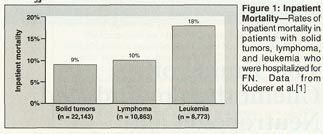 These hospitalizations account for substantial mortality and medical costs. A review of discharge data from the University HealthSystem Consortium (UHC), which comprises 121 institutions, examined inpatient mortality in 41,779 nontransplant patients who had been hospitalized for FN in 1995 through 2000 and found that it was higher in patients with leukemia than in those with lymphoma and solid tumors (Figure 1).[1] The length of hospitalization followed a similar pattern, averaging 19.0 days in patients with leukemia, 10.8 days in those with lymphoma, and 8.5 days in those with solid tumors.[1] The average cost of hospitalization was $37,600 in patients with leukemia, $19,000 in patients with lymphoma, and $12,300 in patients with solid tumors.[1]