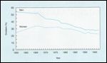 An important accomplishment of the second half of the 20th century has been the reduction of smoking prevalence among persons aged ³18 years from 42.4% in 1965 to 24.7% in 1997, with the rate for men (27.6%) higher than for women (22.1%) (Figure 2). The percentage of adults who never smoked increased from 44% in the mid-1960s to 55% in 1997. In 1998, tobacco use varied within and among racial/ethnic groups. The prevalence of smoking was highest among American Indians/Alaska Natives, and second highest among black and Southeast Asian men. The prevalence was lowest among Asian American and Hispanic women. [Smokeless tobacco use has changed little since 1970, with a 5% prevalence in 1970 and a 6% prevalence in 1991 among men, and 2% and 1%, respectively, among women. The prevalence of smokeless tobacco use is highest among high school males, with prevalence being 20% among white males, 6% among Hispanics males, and 4% among black males. Prevalence of use tends to be lower in the northeastern region and higher in the southern region of the United States.
