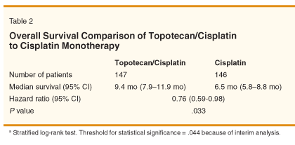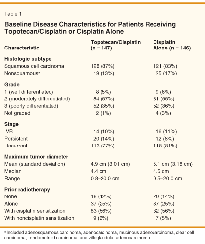 Experimental Design: In a randomized multicenter study enrolling 293 eligible patients, topotecan plus cisplatin (TC) was compared with cisplatin monotherapy. The TC regimen consisted of cisplatin 50 mg/m2 IV over 1 hour on day 1 and topotecan 0.75 mg/m2 IV over 30 minutes on days 1, 2, and 3 every 21 days.