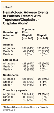 The most common toxicities observed with TC were myelosuppression, nausea and vomiting, mucositis, rash, and hepatotoxicity. These toxicities had previously been described with topotecan. Although myelosuppression was greater in the TC arm, bone marrow toxicity did not appear to be cumulative and was generally manageable. No new categories of toxicity were identified with the addition of cisplatin.