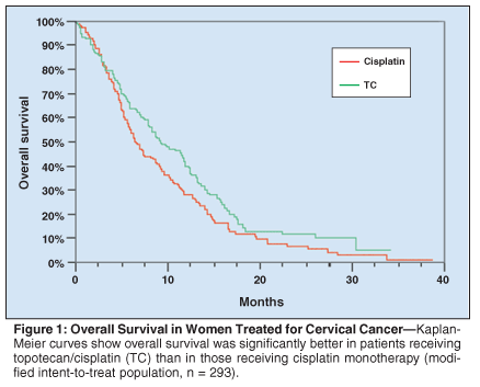 Although several single-agent and combination regimens have previously shown antitumor activity in stage IVB, recurrent, or persistent cervical cancer, none have shown a survival benefit in this setting. The results of GOG-0179 show a survival benefit of topotecan given every 3 weeks with cisplatin in this setting. The findings reported herein provide a rationale for investigating the use of topotecan in cervical cancer patients with less advanced disease. These results also warrant additional investigation of novel agents in patients with cervical cancer who have advanced disease and who progress after surgery and/or radiotherapy.