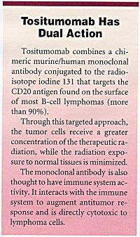 ASCO-Tositumomab (Bexxar), an investigational antibody-based radioim-munotherapy agent, has been shown to be effective as first-line treatment of advanced-stage, low-grade follicular lymphoma, Mark Kaminski, MD, said at the 36th Annual Meeting of the American Society of Clinical Oncology, New Orleans.
