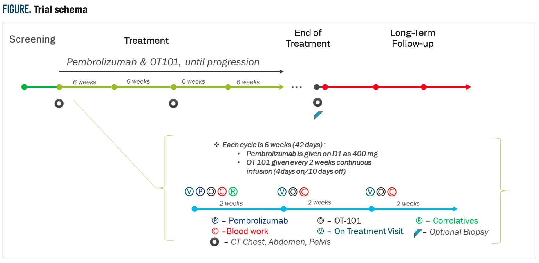 This is an investigator-initiated phase 1/2 trial (NCT06579196) that evaluates the combination of pembrolizumab and trabedersen in patients with treatment-naive advanced NSCLC with PD-L1 expression greater than or equal to 1%. The objective of the first phase is to evaluate safety and the recommended phase 2 dose. The objective of the phase 2 portion of the study is to evaluate the median progression-free survival. Secondary end points include response rate and OS. The study includes the interrogation of a panel of biomarkers that, according to data analysis, predict an improved clinical response to anti–TGF-β2 therapy.