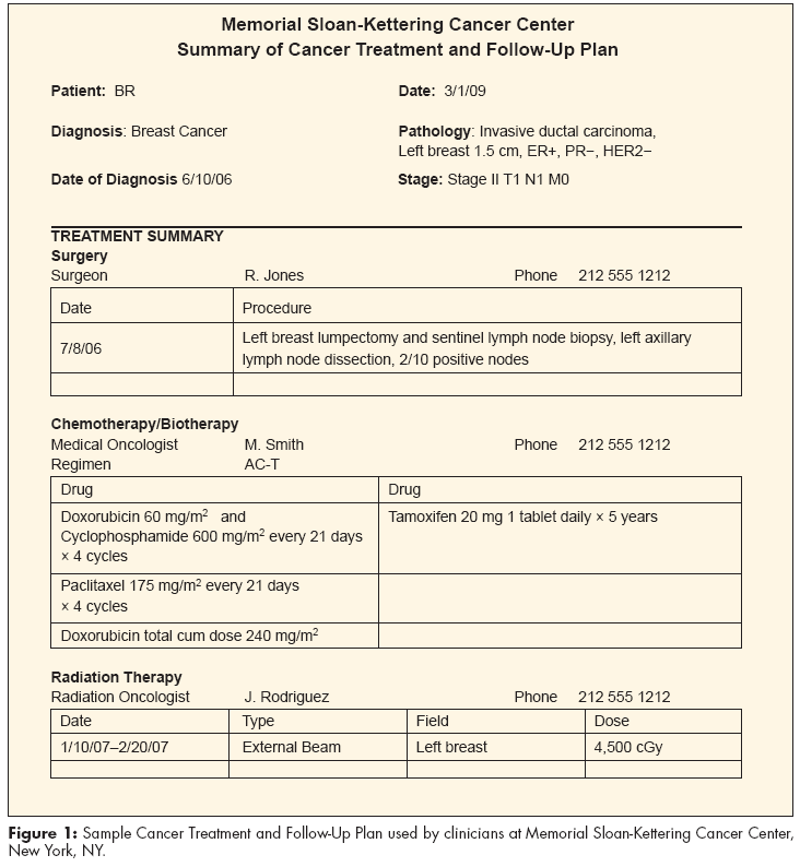Treatment information should include the date range and name of the chemotherapy or biotherapy regimen, drugs, and doses (when relevant); radiation therapy, with the site treated, type of radiation, field, and dose; and any surgical procedures. Additional treatments such as bone marrow transplants and clinical trials should be recorded, as should management of outstanding complications such as chronic graft-versus-host disease following transplant. A comprehensive cancer treatment summary is important for identifying long-term health problems related to the cancer and treatment effects, particularly as the patient transitions away from oncology specialists. In the event of a recurrence or second cancer diagnosis, a record of previous anticancer therapy is essential for safe, effective treatment planning (see Figure 1, “MSKCC Summary of Cancer Treatment and Follow-Up Plan”).