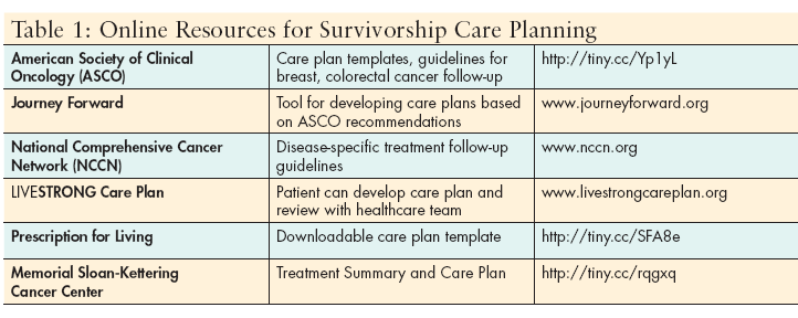 Other groups have developed care plan templates and made them available as resources. Table 1 lists Internet-based resources for survivorship care plan development. Haylock et al.[16] highlight the opportunity for nurses to adopt survivorship care planning as part of their role in educating and counseling patients and providing continuity of care across health transitions.