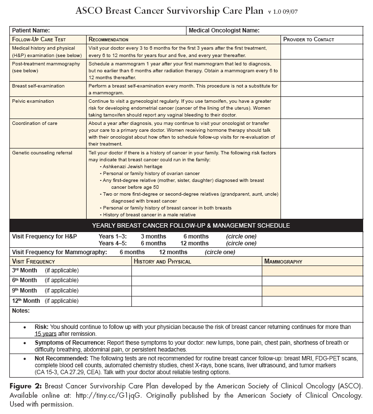 All of these decisions necessarily rely on multidisciplinary collaboration. In view of the identified barriers and considerable variation in practice settings and clinical resources, simplification can prove to be an effective strategy for implementation. The short templates such as those developed by ASCO provide a simple, quick approach to the care plan while covering the core elements (see Figure 2, “ASCO Breast Cancer Survivorship Care Plan”). A more comprehensive plan that includes comorbidities and specialty care requirements is more resource-intensive, but is especially important for survivors who have undergone complex treatments and for childhood cancer survivors.[14]