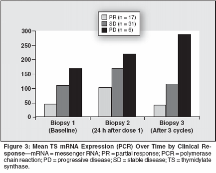 Pemetrexed (Alimta) is a novel folate antimetabolite that primarilyinhibits the enzymes thymidylate synthase (TS), dihydrofolate reductase(DHFR), and glycinamide ribonucleotide formyl transferase(GARFT), all of which are involved in pyrimidine and purine synthesis.In a phase II trial of patients with T3/4, N0–2 breast cancer, expressionof thymidylate synthase (TS), dihydrofolate reductase (DHFR),glycinamide ribonucleotide formyltransferase (GARFT), p53, andc-erb-B2 (at the mRNA or protein level) was examined in tumor biopsyspecimens before and 24 hours after the first dose of pemetrexed andafter three cycles of single-agent treatment to establish correlations ofbiomarker levels and changes with clinical outcome and toxicity. Althoughfinal data are not available, initial indications are that clinicalresponse may correlate with decreased or low TS expression. The resultsobtained from clinical data are supported by laboratory results inthree cell lines (MDA-231, MCF-7, and ZR-75). These results suggestthat in vitro transcript profiling to identify which genes are importantpredictors of successful cytotoxic chemotherapy, followed by a focusedclinical trial to confirm the in vitro results, may be the best approachfor translational research.